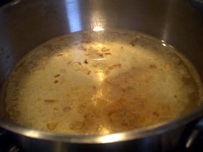 Put enough oil to just barely cover the bottom of the pot. Chop some onion and add to the oil. I use 1/4 of an onion for a small pot of rice, half for a medium pot and a whole onion if I am making enough rice for a large group. There are no accurate measurements for this recipe and the bigger the pot, the more rice you use…the more you will make…simple.