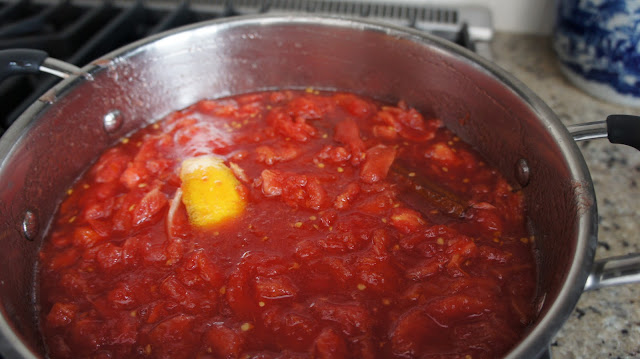 You will need twice as much tomatoes as sugar. I used two pounds of tomatoes and one pound of sugar, weigh after peeling tomatoes.