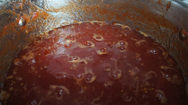 Once mixture begins to boil turn heat down and simmer, stirring occasional for approximately two hours.